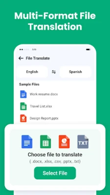 Easy Translate இன் தனித்துவமான திறன்கள் உங்கள் மொழிபெயர்ப்பு அனுபவத்தை ஒரு புதிய நிலைக்கு இட்டுச் செல்கின்றன. உணவக மெனுக்கள் அல்லது தெரு அடையாளங்கள் என எந்த உரையையும் படம் பிடித்து, உடனடியாக மொழிபெயர்ப்பைப் பெறுங்கள். முக்கியமான உரையாடல்களின் போது, பிளவுபட்ட திரை அம்சம் மூலம் மூலத்தையும் மொழிபெயர்ப்பையும் ஒரே நேரத்தில் பார்க்க முடியும். இது ஆங்கிலம், ஸ்பானிஷ், பிரஞ்சு, ஜேர்மன், ஜப்பானிய, கொரியன், சீன மற்றும் பல மொழிகளை ஆதரிக்கிறது. பயணம், வணிகம் அல்லது அன்றாட உரையாடல்களுக்கான பொதுவான சொற்றொடர்களை உள்ளடக்கிய உள்ளமைக்கப்பட்ட கையேடு, தொடக்கநிலையாளர்களுக்கும் பயணிகளுக்கும் மிகவும் பயனுள்ளதாக இருக்கும். DOCX, PPTX, XLSX, TXT, CSV போன்ற பல வடிவ கோப்புகளையும் எளிதாக மொழிபெயர்க்கலாம்.
